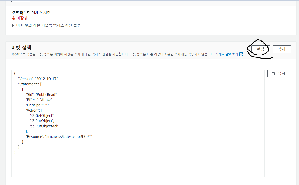 ์ด ์ ์ฉ๋๋ resource ์ง์ . ์ฌ๊ธฐ์ testcolor99b ๋ผ๋ ์ด๋ฆ์ s3 ๋ฒํท์ ๋ชจ๋ ๊ฐ์ฒด์ ์ ์ฉํ๊ฒ ๋๋ค.