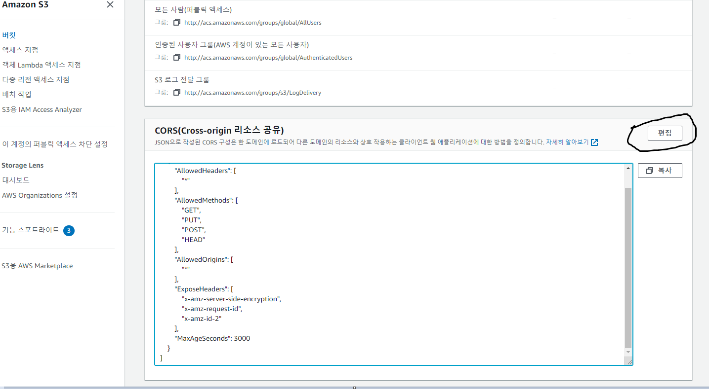 - s3:PutObjectAcl : ๊ฐ์ฒด์ ๋ํ ์ก์ธ์ค ์ ์ด ๋ชฉ๋ก์ ์ค์ ํ ์ ์๋ ๊ถํ