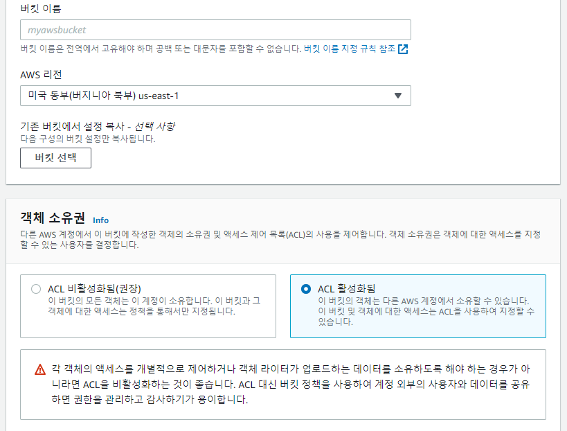 acl : ํ์ผ์ ์ ๊ทผ ๊ถํ public-read ๋ ๋๊ตฌ๋ ์ฝ์ ์ ์๋๋ก ํ์ฉ