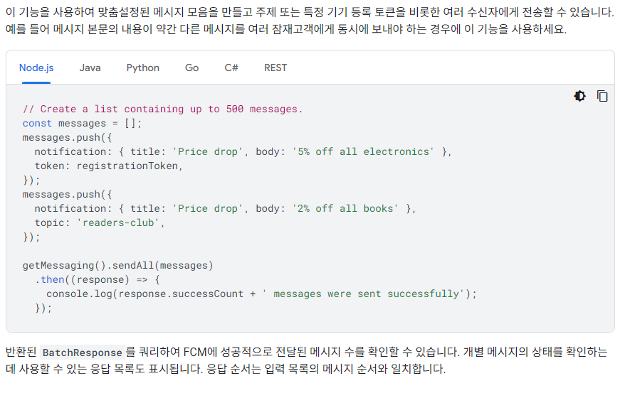 - 여러 기기에 전송 : 호출당 최대 500개의 기기 등록 토큰 지정 가능 (기기 등록 토큰 목록에 메시지를 멀티캐스트 하는 방식) - REST API 및 Admin FCM API 사용